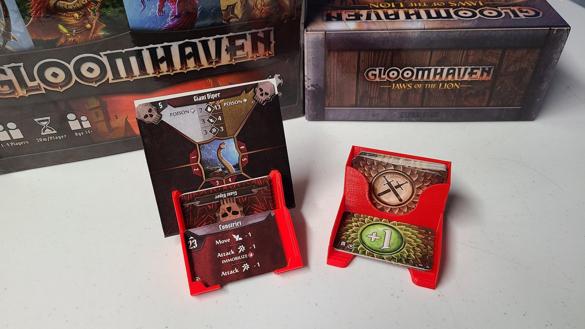 Attack Modifier Deck Stand - Easily keep attack modifier decks well organized and in place while still being able to easily flip cards and see the outcome. The stand also acts as a shield for unflipped cards to prevent "accidentally" seeing what's about to come up. Works for both monster decks as well as character decks.